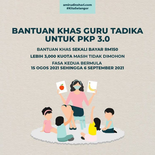 Pakej Kita Selangor 2.0 menawarkan bantuan khas. Dari sasaran 10,197 guru yang bakal menerima manfaat ini, sebanyak 7,177 telah mengemukakan permohonan bantuan fasa pertama. Kira-kira 3,000 guru Taman Bimbingan Kanak-Kanak (Tadika) di Selangor masih belum memohon bantuan yang ditawarkan kerajaan negeri bagi meringankan beban golongan itu yang terkesan akibat Perintah Kawalan Pergerakan (PKP).