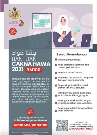 Kerajaan Negeri Kelantan telah memperkenalkan BANTUAN CAKNA HAWA khas untuk golongan pekerja wanita yang mempunyai pendapatan isi rumah sebanyak RM3,000.00 ke bawah. Bantuan ini adalah sebagai tanda penghargaan dan terima kasih atas pengorbanan, jasa dan khidmat yang telah dicurahkan kepada masyarakat.