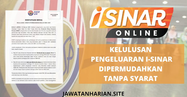 KUALA LUMPUR : Berikutan pengumuman yang dibuat oleh Menteri Kewangan, Tengku Datuk Seri Zafrul Tengku Abdul Aziz, Kumpulan Wang Simpanan Pekerja (KWSP) mengumumkan bahawa ahli di bawah umur 55 tahun yang telah membuat permohonan bagi kemudahan i-Sinar akan diberikan kelulusan bermula 8 Mac 2021 termasuk permohonan baharu yang diterima selepas tarikh tersebut.