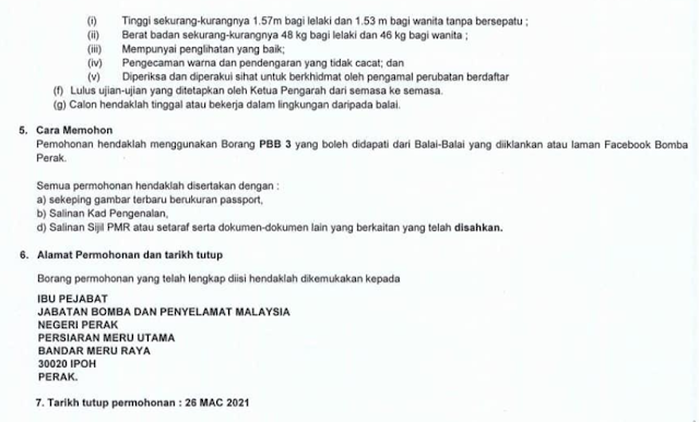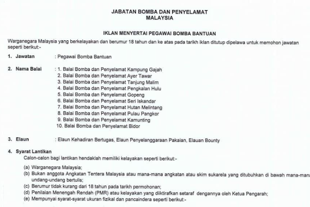 Jawatan Terkini. Tawaran ini adalah dipelawa kepada Warganegara Malaysia yang berkelayakan bagi mengisi permohonan kekosongan jawatan di Jabatan Bomba dan Penyelamat Malaysia 2021.