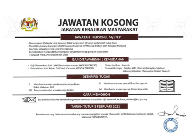 Jabatan Kebajikan Masyarakat (JKM) kini telah membuka tawaran dalam pengambilan jawatan kosong kepada seluruh warganegara Malaysia yang berumur 18 tahum ke atas yang berminat dengan bidang yang ditawarkan.