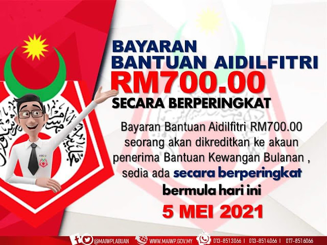 Bayaran Bantuan Aidilfitri akan dikreditkan ke akaun penerima Bantuan Kewangan Bulanan sedia ada secara berperingkat bermula :