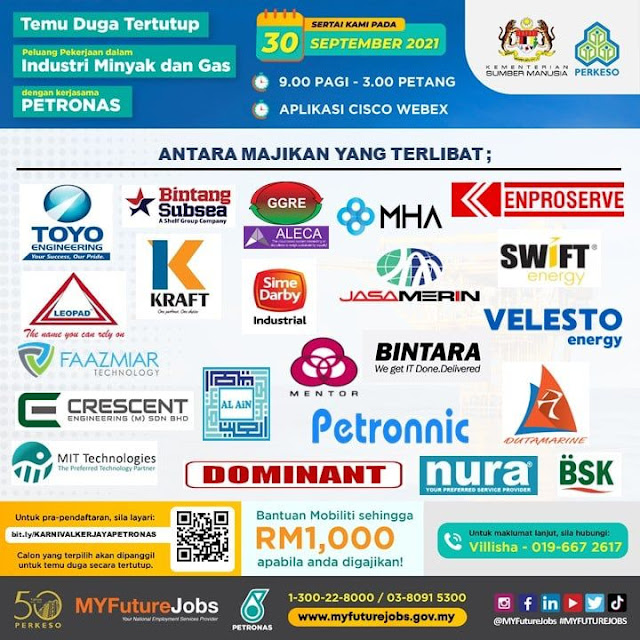 PERKESO dengan kerjasama PETRONAS akan mengadakan Karnival Kerjaya secara online bagi pengambilan pekerja dalam industri minyak dan gas. Temuduga ini dianjurkan khusus kepada rakyat Malaysia yang belum dapat pekerjaan atau menganggur.