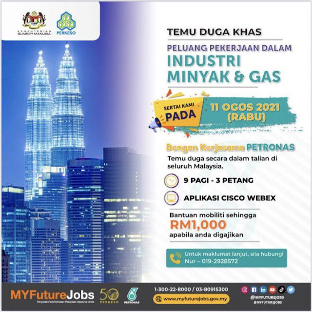PERKESO dengan kerjasama PETRONAS akan mengadakan Karnival Kerjaya secara online bagi pengambilan pekerja dalam industri minyak dan gas pada 11 Ogos 2021 (Rabu) bermula jam 9.00 pagi hingga 3.00 petang.