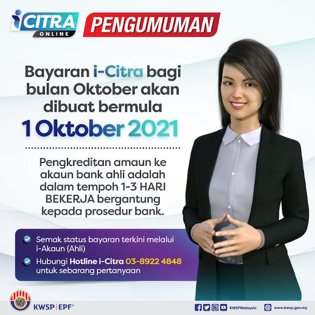 KWSP juga telah memaklumkan Ahli yang telah buat permohonan boleh buat semakan status permohonan secara online. Bayaran bulan Oktober 2021 akan dibuat pada awal bulan. Pemohon dah boleh semak tarikh bayaran i-Citra bulan Oktober masing-masing dan jadual bayaran bulanan secara online.